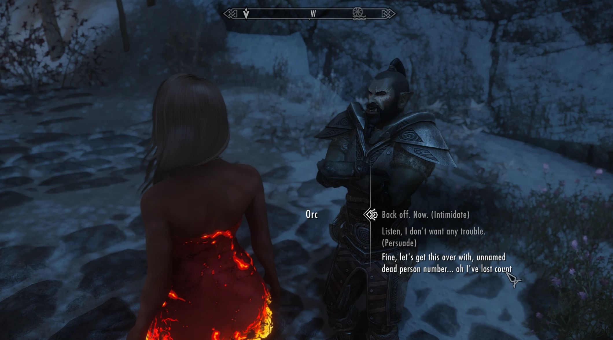 At higher levels, the Dovahkiin will always pass either the Intimidate check or the Persuasion check, resulting in the Taunting Adventurer safely walking away.