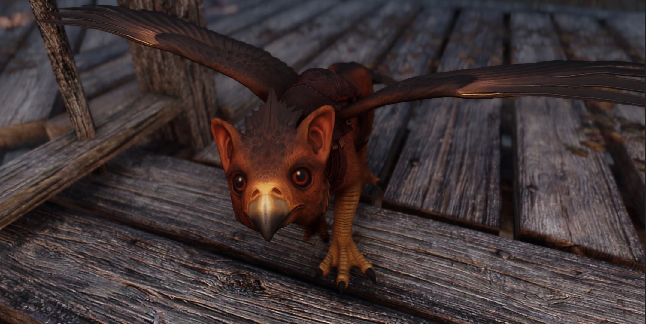Affectionate and calm by nature, Anwi never accepted Elarwen, perhaps out of jealousy for the love she had lost. Knowing the fledgling deserved better care, Elarwen entrusted her to her friend Wylandriah, the Bosmer court mage of Riften. Wylandriah, however, is known for her distracted habits and soon neglected the creature. Taking Anwi for yourself would be a kindness to both the mage and the little gryphon.