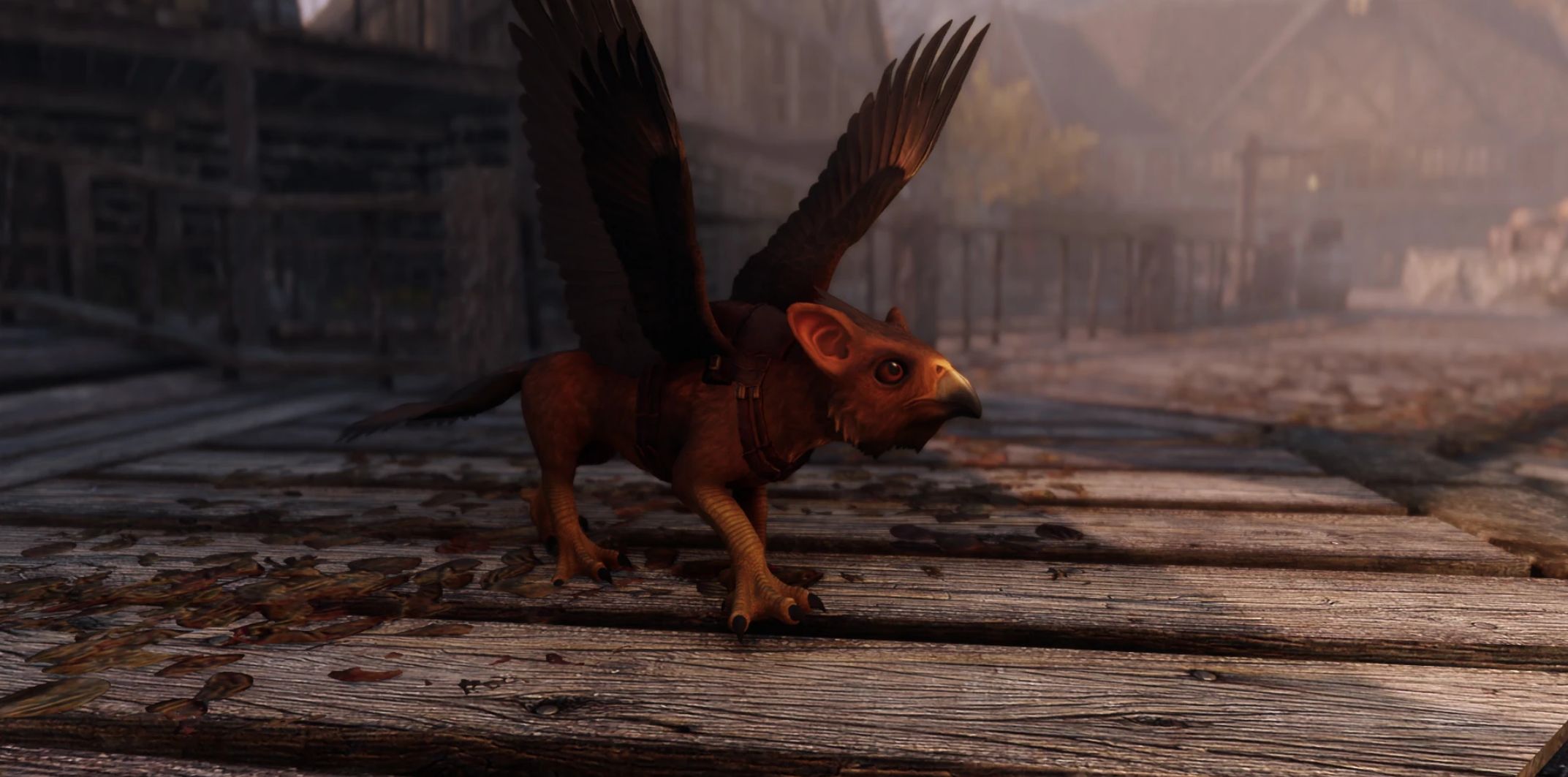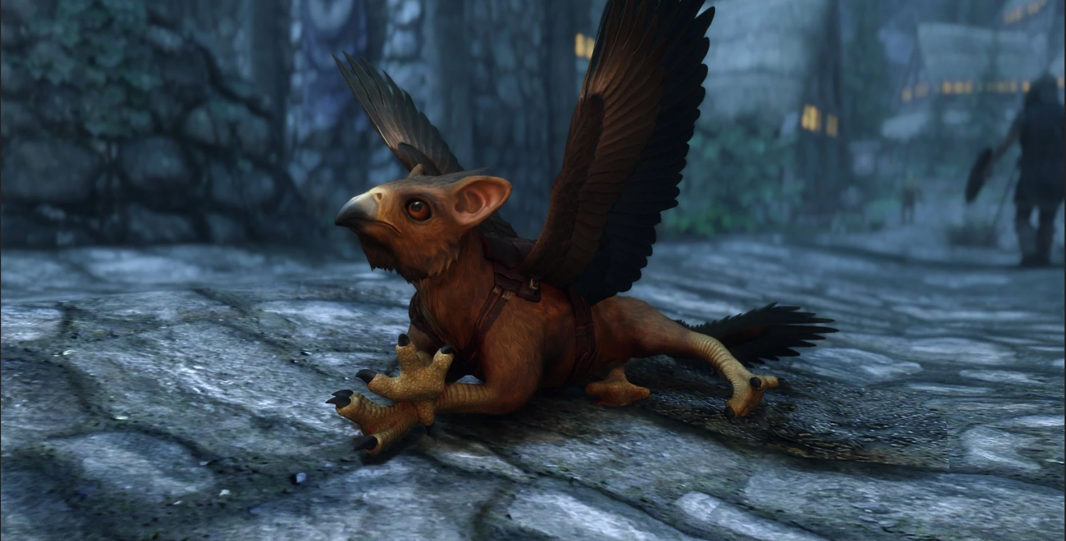Affectionate and calm by nature, Anwi never accepted Elarwen, perhaps out of jealousy for the love she had lost. Knowing the fledgling deserved better care, Elarwen entrusted her to her friend Wylandriah, the Bosmer court mage of Riften. Wylandriah, however, is known for her distracted habits and soon neglected the creature. Taking Anwi for yourself would be a kindness to both the mage and the little gryphon.