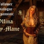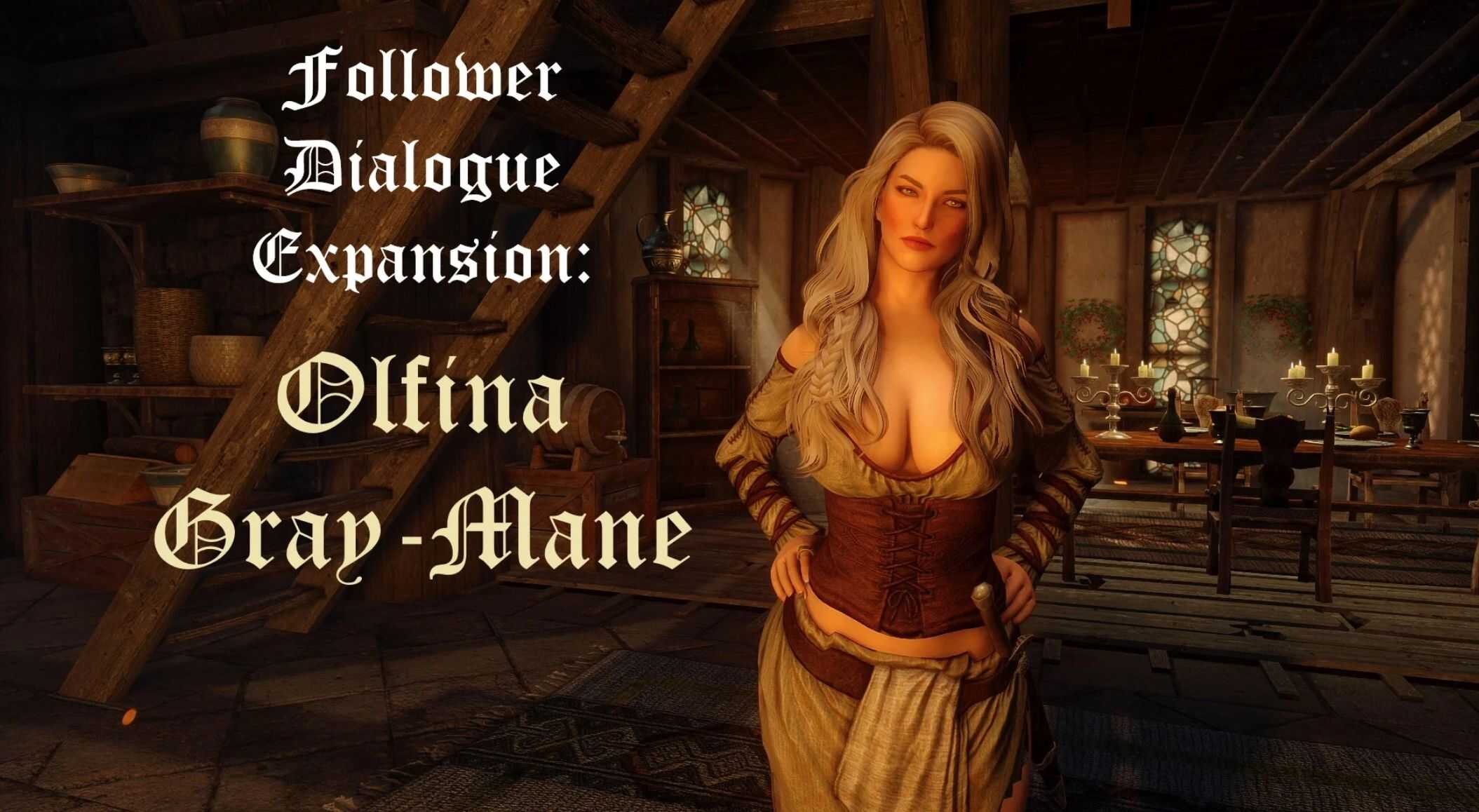 Makes Olfina Gray-Mane, the Strong Nord Woman of Whiterun, a fully-fledged follower with 398 lines. Quest and environmental awareness.