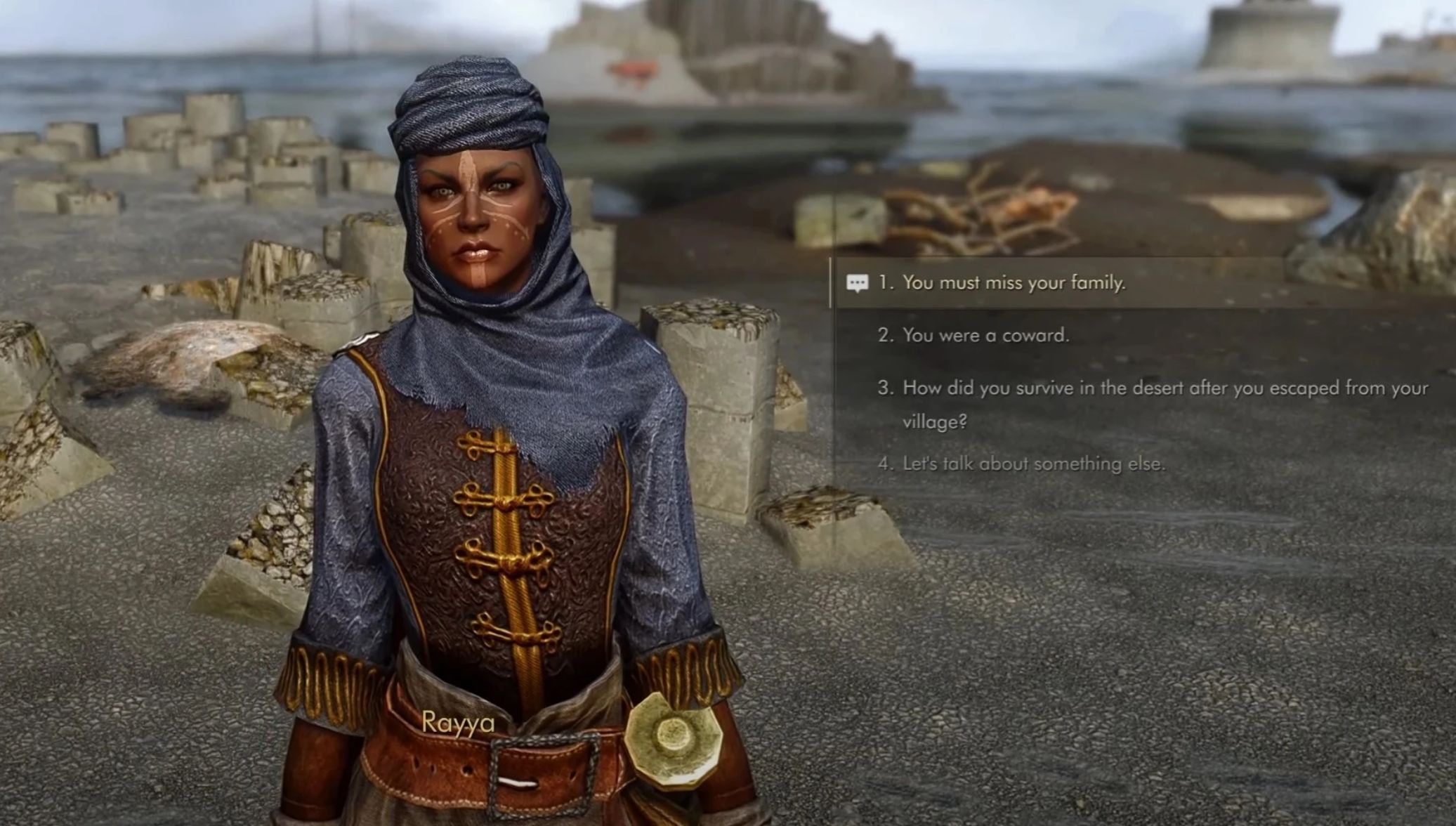 In this mod, Rayya is expanded as a desert warrior haunted by her past sins and struggling to find redemption. She punishes herself by refusing to be loved. This is almost a Middle Eastern-themed Western in an Elder Scrolls setting.