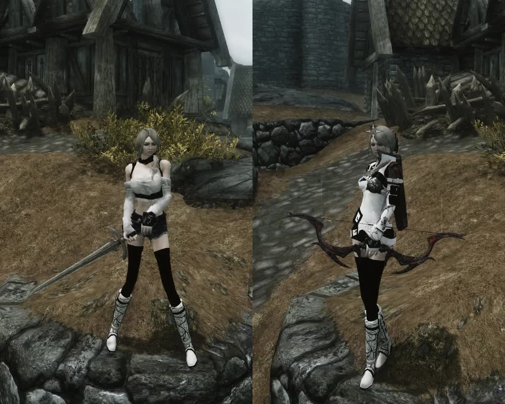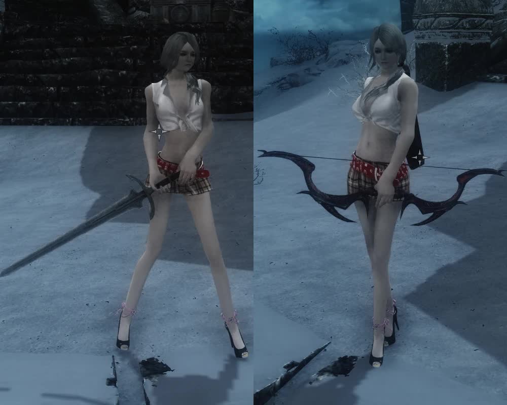 Clothes used by me in images are most likely not found on nexus. Everything is downloaded from other sites/ported from oblivion/ported from other games. Everything is also edited by me so the body proportions are thinner and longer. Do not ask me for clothes because first of all I most likely do not have copyrights to distribute them, and second of all you will not probably not want them because they clip with everything that isn’t made specifically for myself and are beyond anorexic in proportion by nexus standards. Besides all that it would also be too time consuming to get the files together for each individual one for dl.