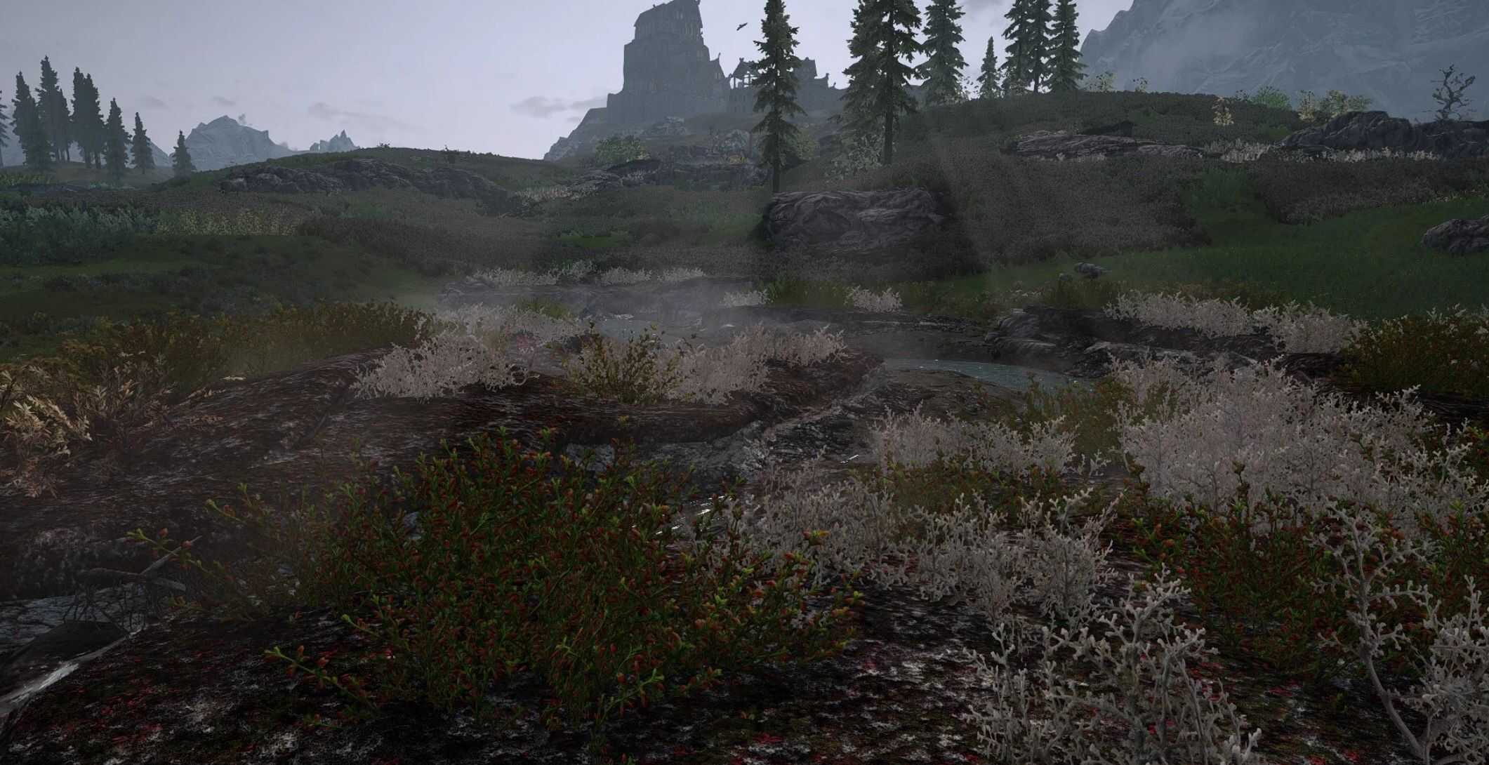 This mod changes the appearance of the Tundra Flora drastically. It comes with terrain textures, new grasses and a ton of other plants, shrubs and trees. It covers the vast area from Whiterun Bridge to Loreius Farm, halfway to Valtheim Towers, over to the small bridge before Dragon Bridge, Cliffside Retreat, Rorikstead to the Reach…